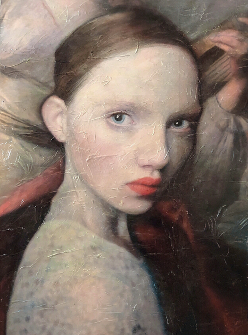 sometimes upward of 100 separate applications of color are combined to create the final surface. The quality of layering is heightened by the use of paper, as it moves and crinkles during its application to create physical depth. Classical Flemish glazing techniques - unusually applied almost exclusively with the artist’s right index finger - and the aged appearance of the painted surface give these figures a timeless quality, a frozen moment of physical time filled with universal human emotion.”